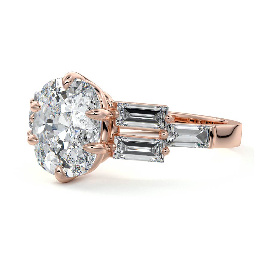 This exquisite engagement ring features a stunning Oval cut lab grown diamond, elegantly flanked by baguette sidestones set in lustrous rose gold. A modern classic, it offers captivating brilliance and a sophisticated silhouette perfect for a lifetime of love.