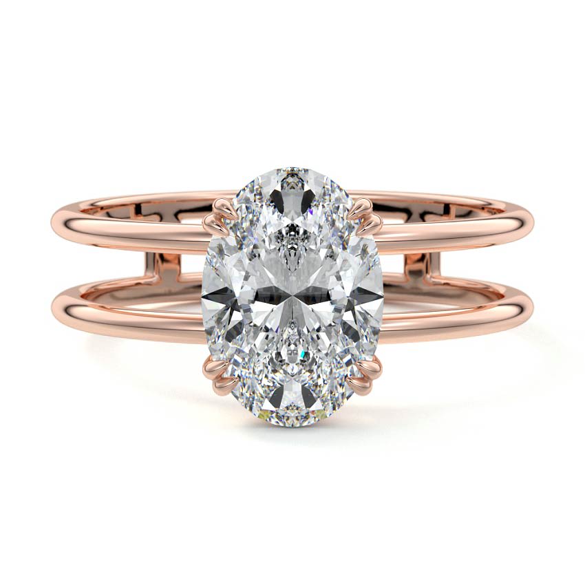 Showcasing a captivating oval cut lab grown diamond, this ring features a sophisticated split shank solitaire setting. Its sleek, modern design highlights the elongated brilliance of the center stone, offering a truly elegant statement.