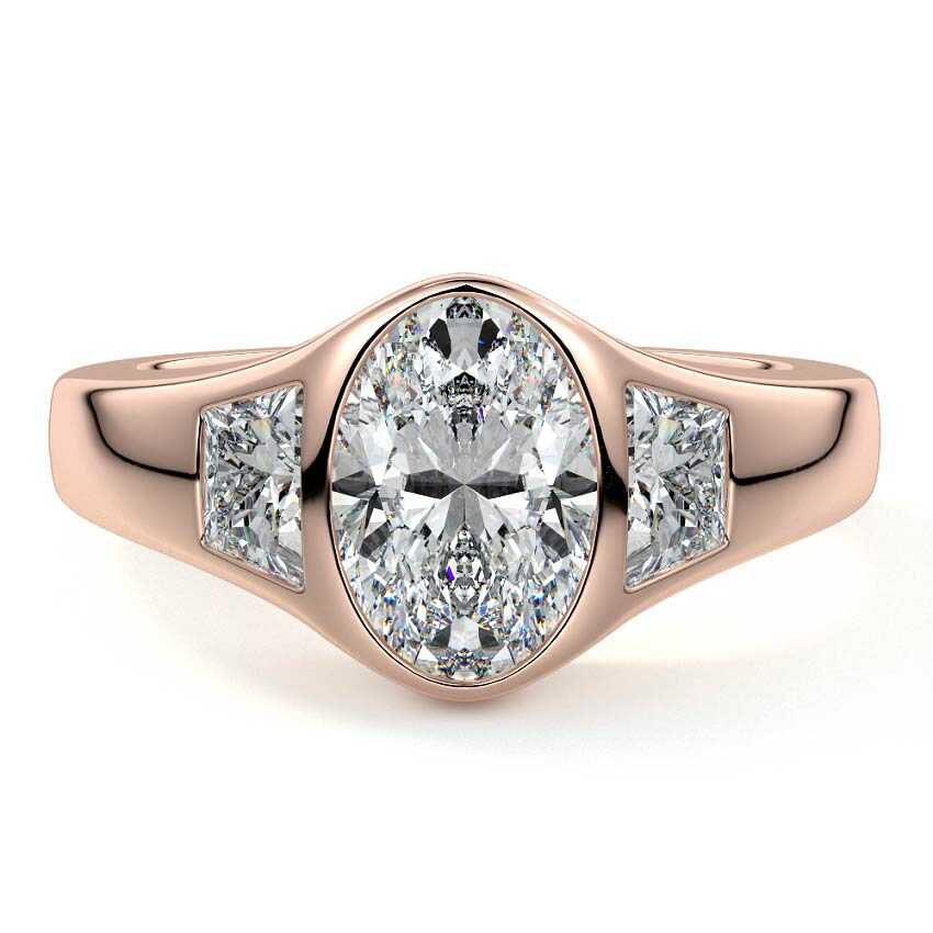 Experience modern elegance with this captivating three-stone engagement ring, showcasing a brilliant oval cut lab grown diamond at its heart. Flanked by unique side diamonds seamlessly integrated into a sleek, polished band, this ring offers a sophisticated and contemporary statement.