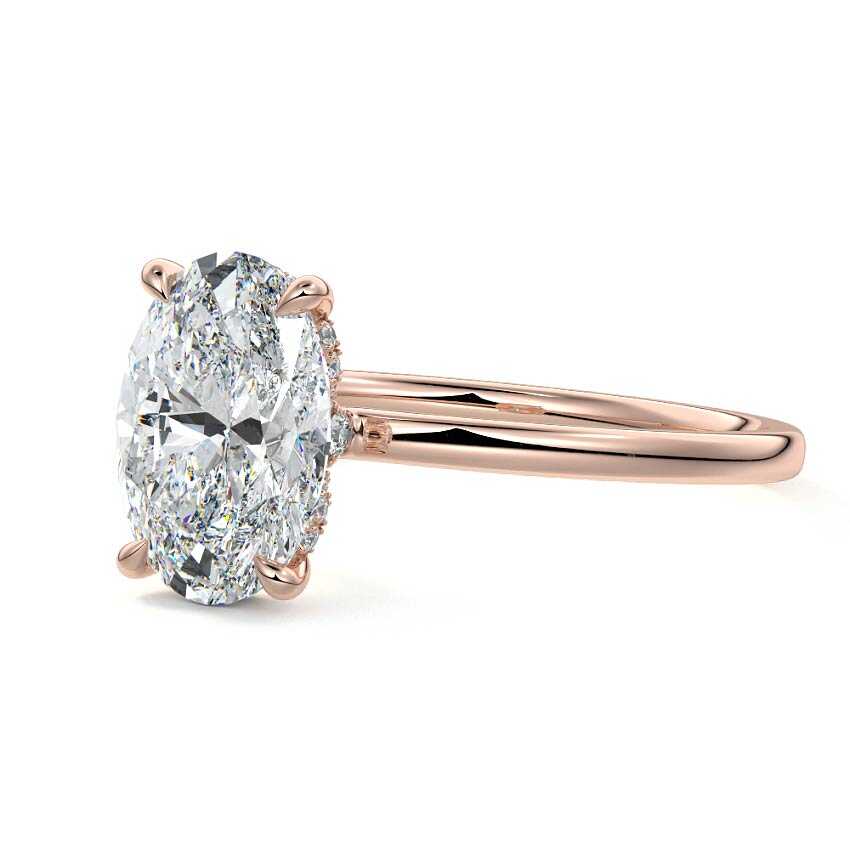 This exquisite engagement ring features a dazzling Oval cut lab grown diamond, radiating brilliance from every angle. A delicate hidden halo adds a discreet layer of sparkle, elevating the stone's natural fire and creating a truly captivating design.