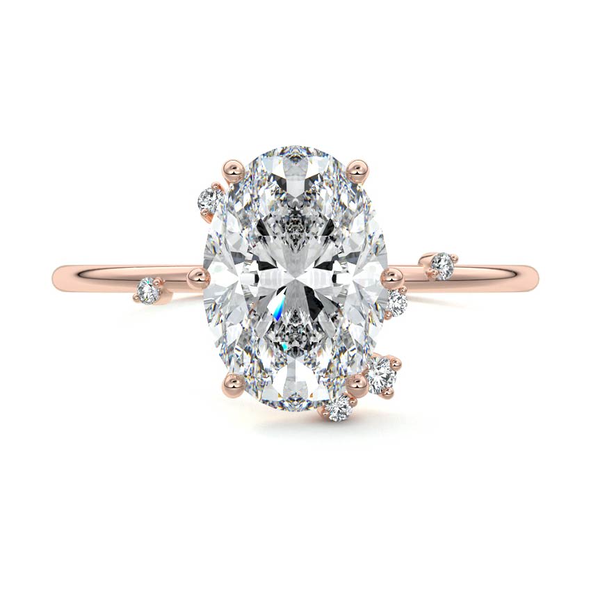This exquisite engagement ring features a brilliant Oval cut lab grown diamond, elegantly set in a unique nature-inspired design. Delicately scattered accent diamonds create a whimsical, organic sparkle around the center stone and along the slender band, evoking the beauty of a starlit garden.