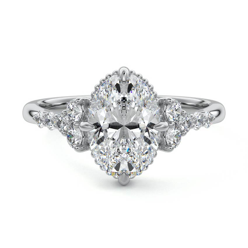 This captivating engagement ring showcases a brilliant Oval cut lab grown diamond, radiating with exceptional sparkle. Encircling the exquisite center stone is delicate milgrain detailing, flanked by gracefully clustered sidestones that enhance its vintage charm and luxurious allure. A truly timeless piece, perfect for celebrating enduring love.