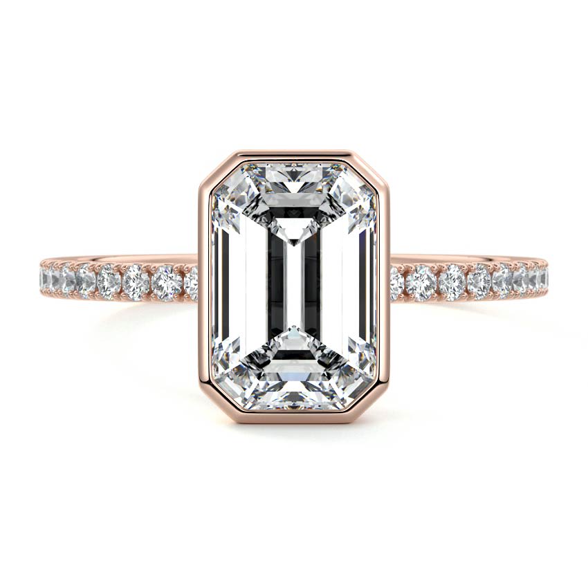 This exquisite engagement ring features a stunning Emerald cut lab grown diamond, renowned for its captivating step-cut facets and timeless appeal. The sleek bezel setting elegantly frames the center stone, perfectly complemented by a delicate pave diamond band, adding a touch of brilliant sparkle.