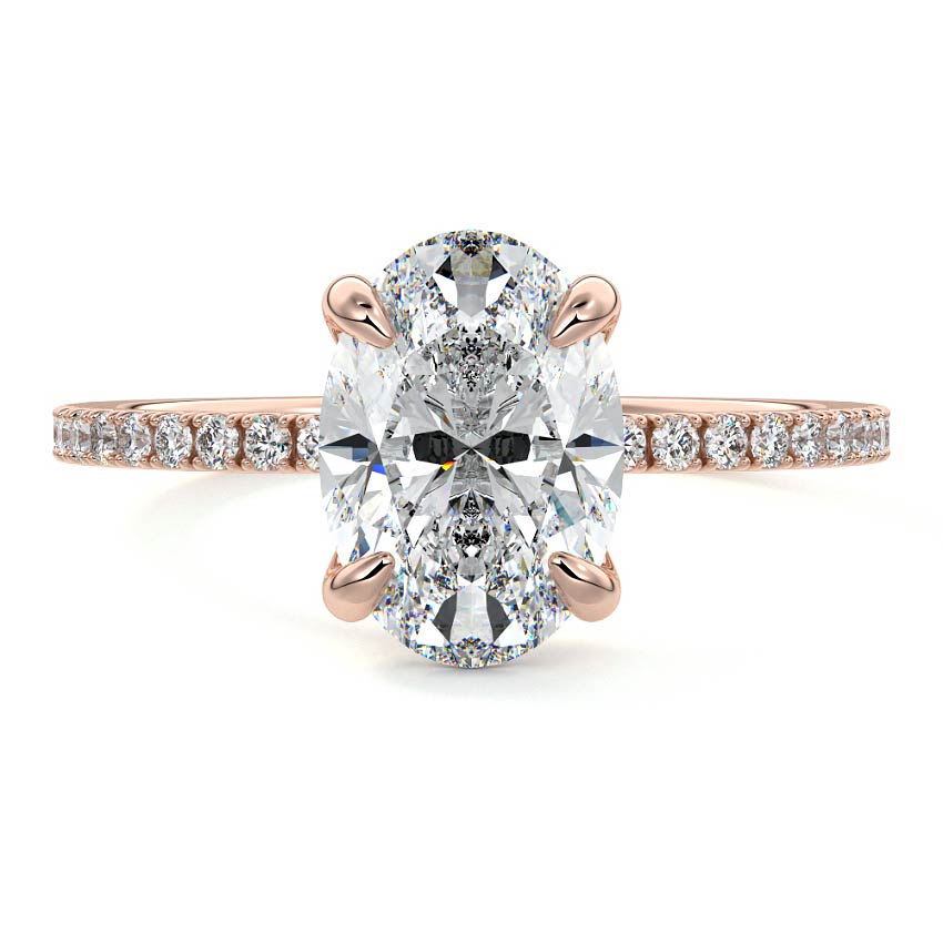 This exquisite engagement ring features a brilliant Oval cut lab grown diamond as its captivating center, exuding timeless grace and sophisticated allure. The elongated silhouette of the main stone is beautifully complemented by a delicate pave band, adorned with a continuous line of sparkling accent diamonds.