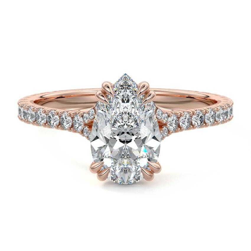 This exquisite engagement ring features a stunning Pear cut lab grown diamond, elegantly held by nature-inspired prongs. A brilliant pave diamond band adds continuous sparkle, creating a truly enchanting and unique design.