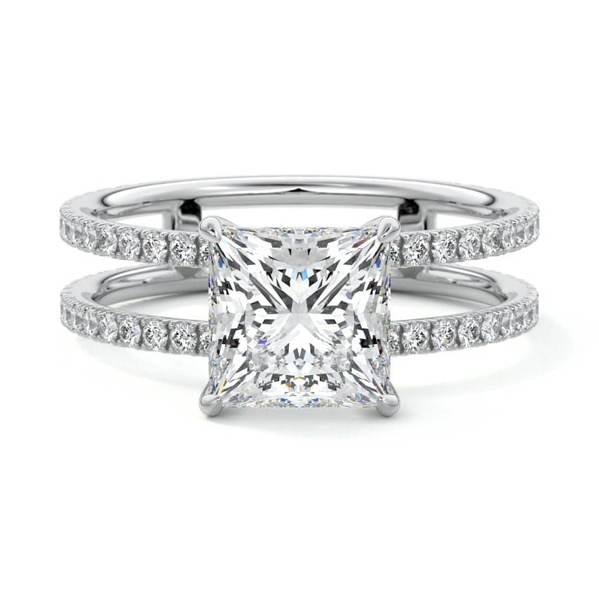 This exquisite ring showcases a striking Princess cut lab grown diamond, renowned for its sharp, brilliant facets and geometric appeal. The luxurious split pave band, encrusted with smaller diamonds, frames the center stone beautifully, offering continuous sparkle and modern elegance.