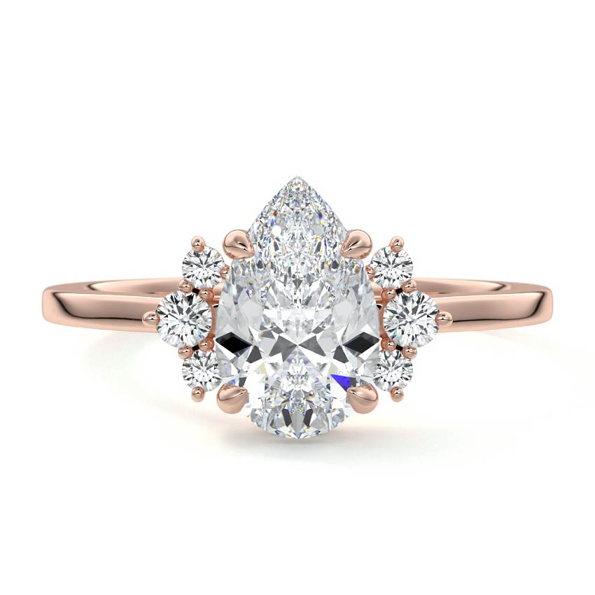 Adorned with a captivating Pear cut lab grown diamond, this ring showcases an exquisite Nature Inspired design. Smaller accent diamonds form an organic cluster around the magnificent center stone, creating a truly enchanting and sparkling display.