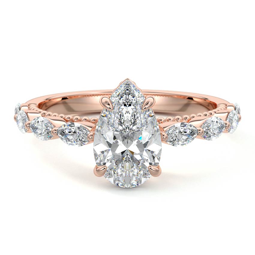 This captivating engagement ring features a stunning Pear cut lab grown diamond as its radiant centerpiece, gracefully embraced by a nature-inspired setting. Delicate pear-shaped sidestones and beaded milgrain details adorn the band, creating a romantic and visually harmonious design.