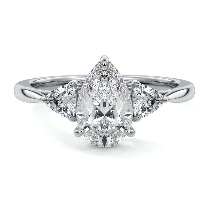 This exquisite three-stone engagement ring features a stunning pear-shaped lab grown diamond at its heart, flanked by two complementary pear side stones. The elegant design beautifully accentuates the brilliant sparkle of the diamonds, making it a truly captivating piece.