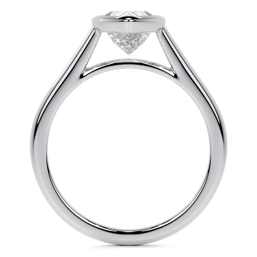 This elegant solitaire engagement ring features a stunning pear-cut lab grown diamond, exuding graceful sophistication. Encased in a sleek bezel setting, its distinctive silhouette offers both modern appeal and protective beauty, perfect for a refined aesthetic.