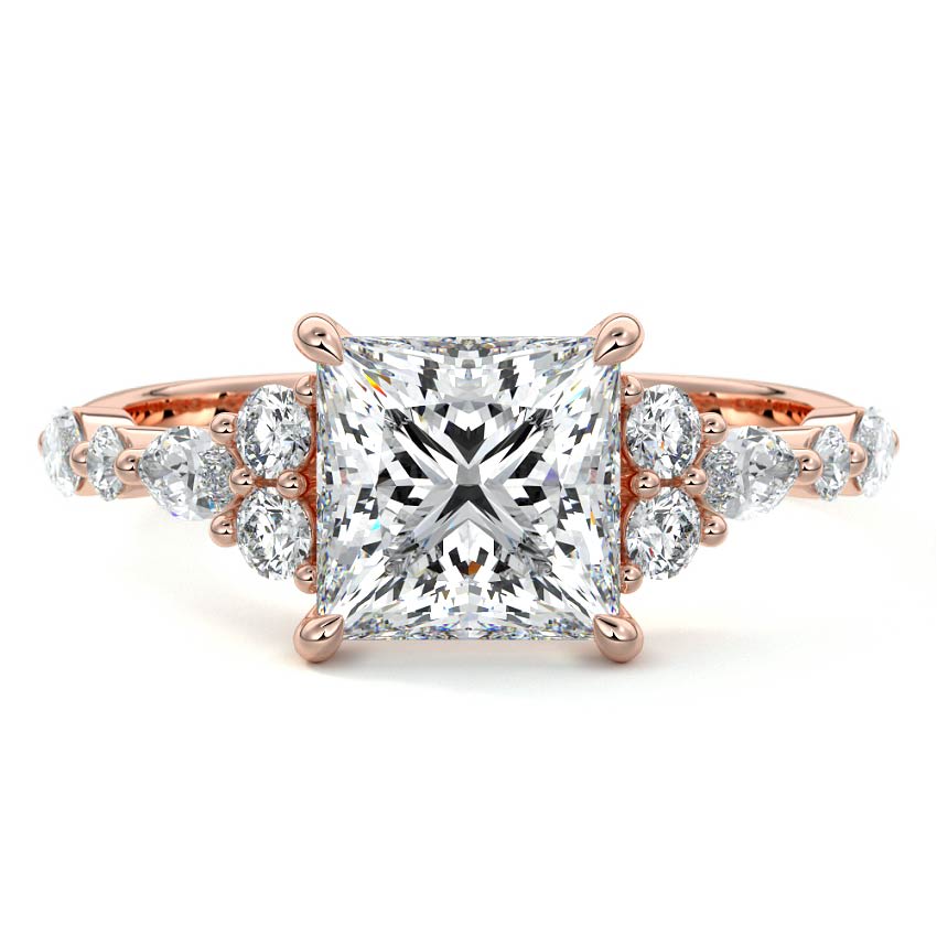 This exquisite engagement ring showcases a stunning Princess cut lab grown diamond at its heart, renowned for its brilliant sparkle and sharp, geometric lines. It is gracefully complemented by clusters of dazzling sidestones along the rose gold band, creating a captivating display of light and contemporary elegance. This design offers a sophisticated blend of classic allure and modern flair.