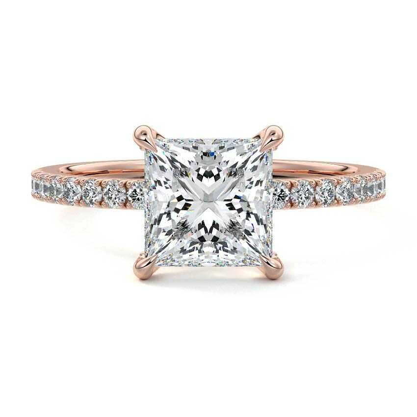 This exquisite engagement ring showcases a brilliant Princess cut lab grown diamond, radiating modern elegance with its sharp, clean lines. The dazzling center stone is perfectly complemented by a delicate pave diamond band, adding an extra layer of sparkle and sophistication to this timeless piece.