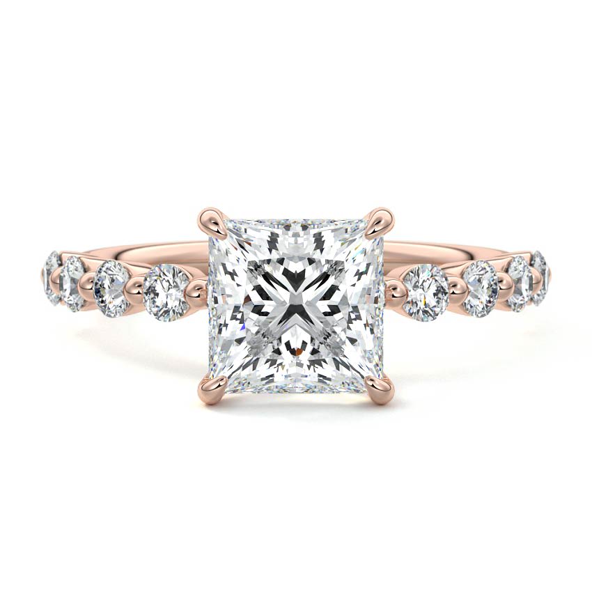 This exquisite engagement ring features a stunning Princess cut lab grown diamond as its center stone, beautifully complemented by brilliant sidestones adorning the band. Its clean lines and radiant sparkle create an elegant and timeless statement, perfect for a modern proposal.