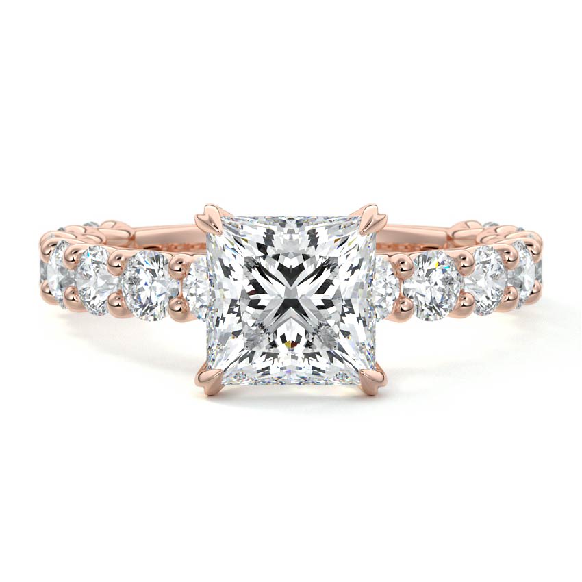 This captivating engagement ring features a brilliant Princess cut lab grown diamond, radiating exceptional sparkle with its sharp, geometric lines. Flanked by an elegant array of round side stones along the band, it offers a contemporary yet timeless design perfect for a stunning proposal.