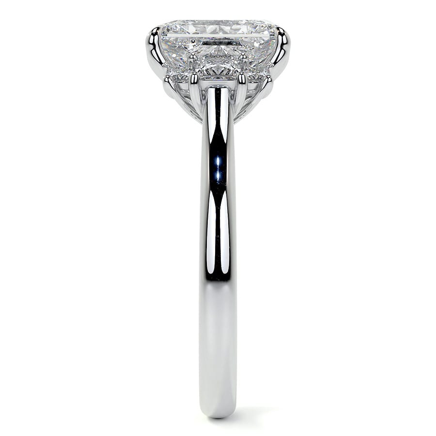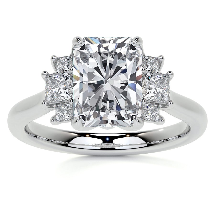 This exquisite engagement ring showcases a brilliant Radiant cut lab grown diamond at its center, known for its captivating sparkle and sophisticated rectangular outline with cropped corners. It is elegantly flanked by a total of six smaller sidestones, enhancing the ring's overall radiance and creating a truly modern and dazzling aesthetic.