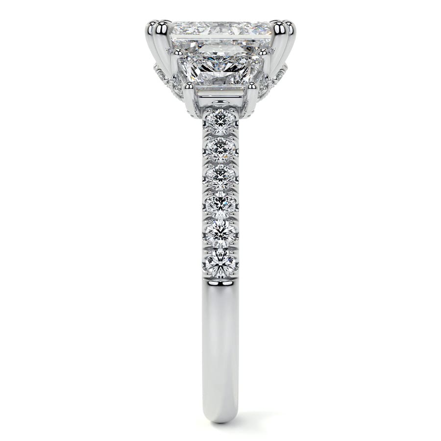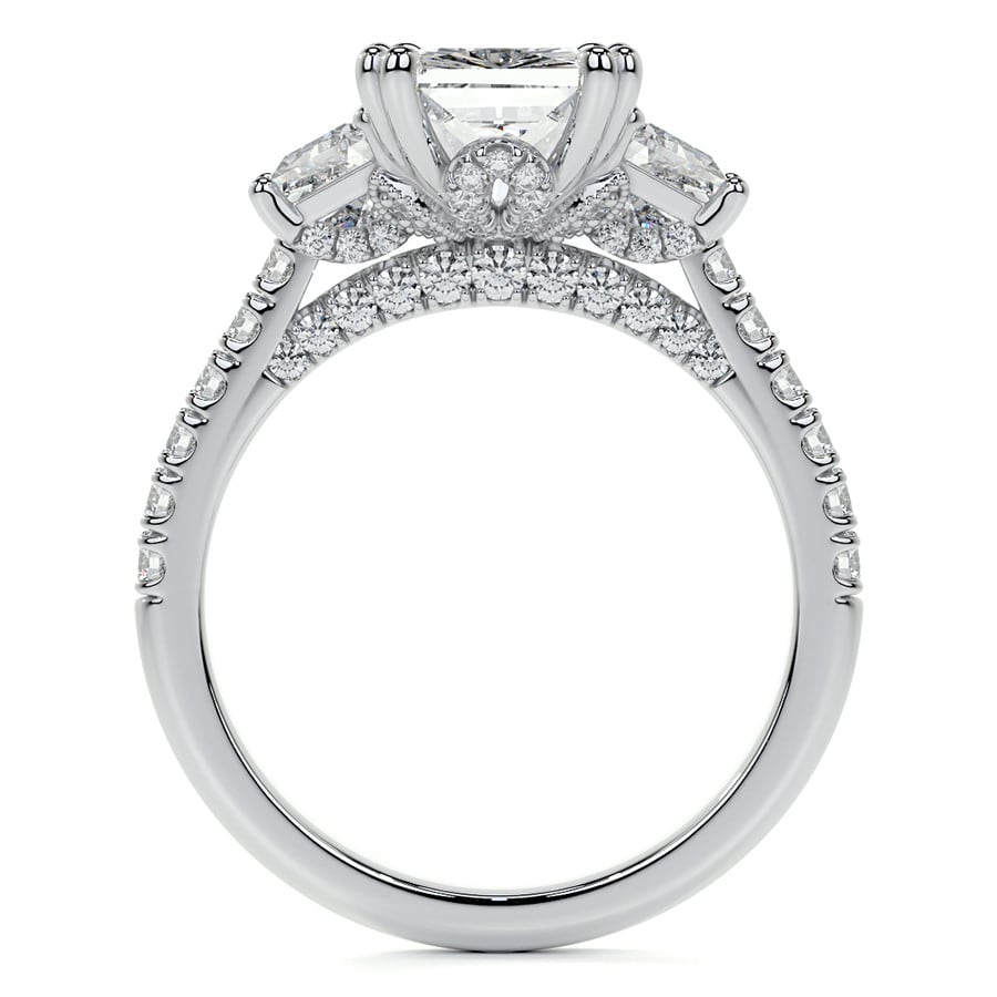 This magnificent three-stone engagement ring features a stunning rectangular Cushion cut lab grown diamond at its heart, beautifully complemented by two brilliant trillion-cut diamonds. The elegant pave-set band adds an extra layer of sparkle, creating a truly luxurious and timeless design.