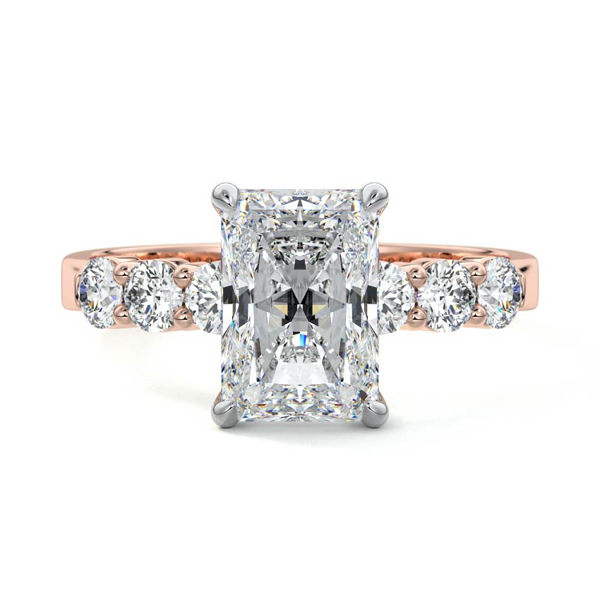 Showcasing a breathtaking Radiant cut lab grown diamond at its heart, this ring radiates contemporary elegance. Its brilliant facets are perfectly complemented by dazzling sidestones set along the sleek band, creating an exceptional display of sparkle.