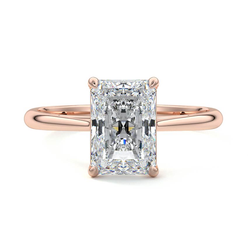 This stunning engagement ring features a dazzling Radiant cut lab grown diamond, renowned for its brilliant sparkle and elegant rectangular shape with cropped corners. Set in a classic solitaire style, its captivating beauty is perfectly highlighted by a sleek and understated band, making it a timeless symbol of love.