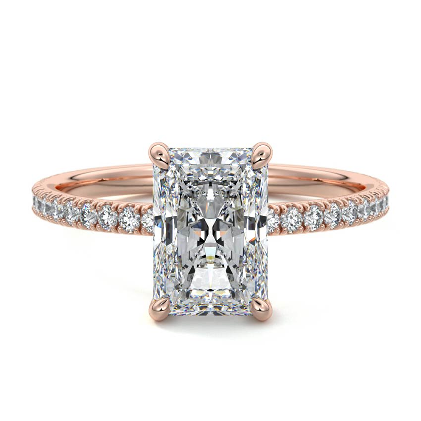 A stunning Pave Radiant cut lab grown diamond engagement ring that combines classic elegance with modern sparkle. Its elongated rectangular shape and brilliant facets offer breathtaking fire and scintillation, making it a captivating choice.