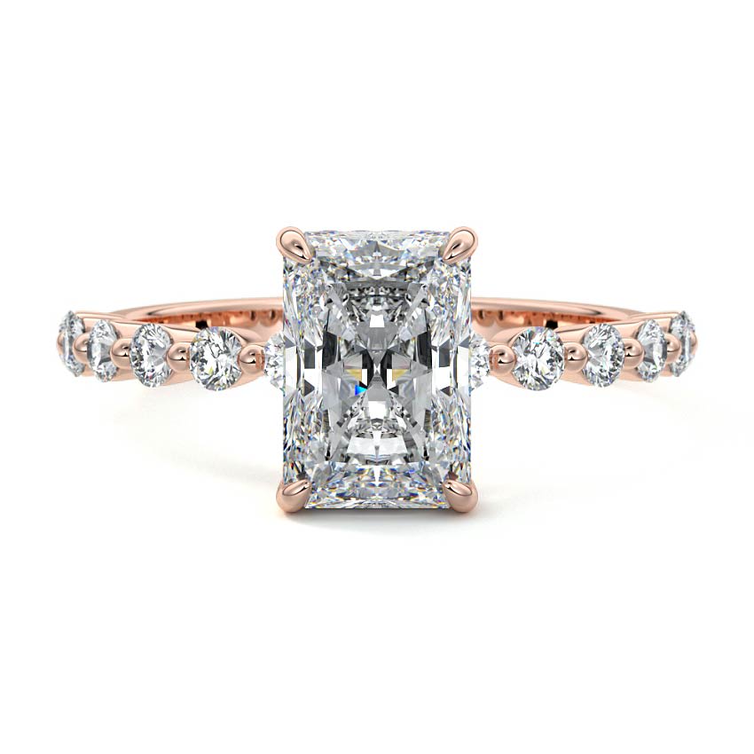 This exquisite engagement ring features a stunning Radiant cut lab grown diamond as its captivating centerpiece, radiating exceptional brilliance. Adorned with delicate sidestones along the elegant band, it offers a harmonious blend of classic sophistication and modern sparkle, perfect for an unforgettable declaration of love.