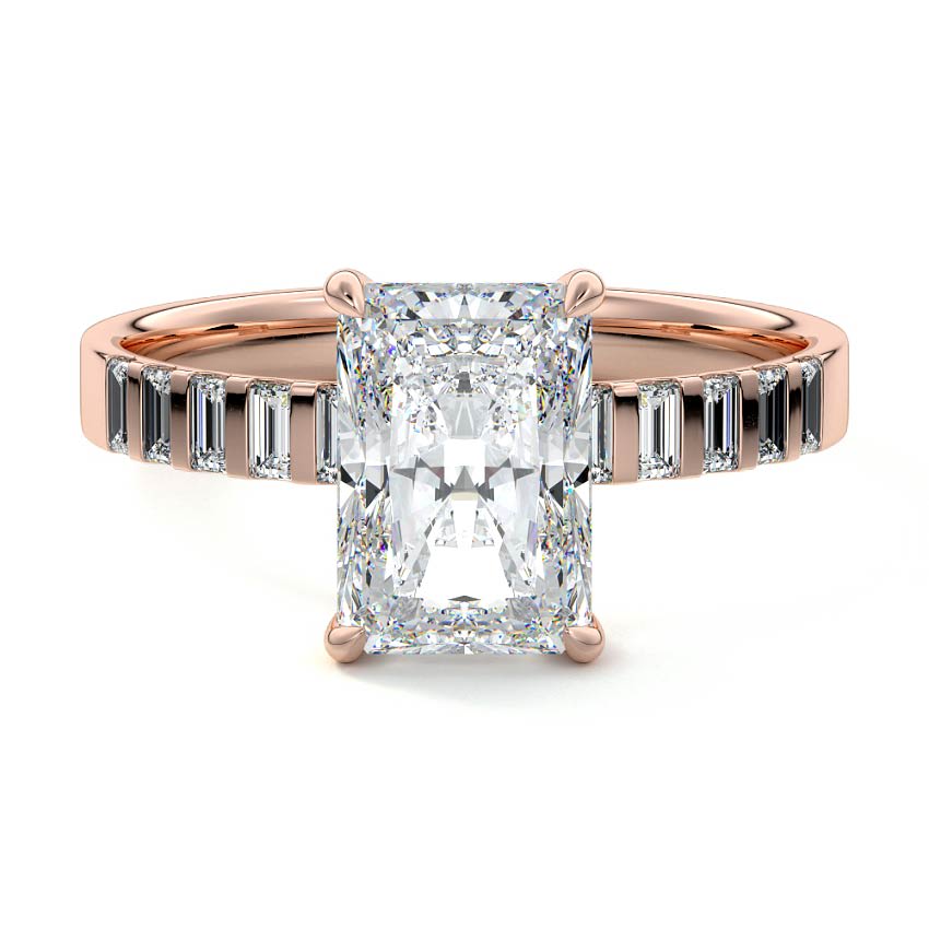 This exquisite engagement ring showcases a brilliant Radiant cut lab grown diamond as its captivating center stone, celebrated for its exceptional sparkle and elegant rectangular outline with cropped corners. The band features an artful arrangement of baguette-cut diamonds, creating a distinctive and modern aesthetic that enhances the main gem's radiance.