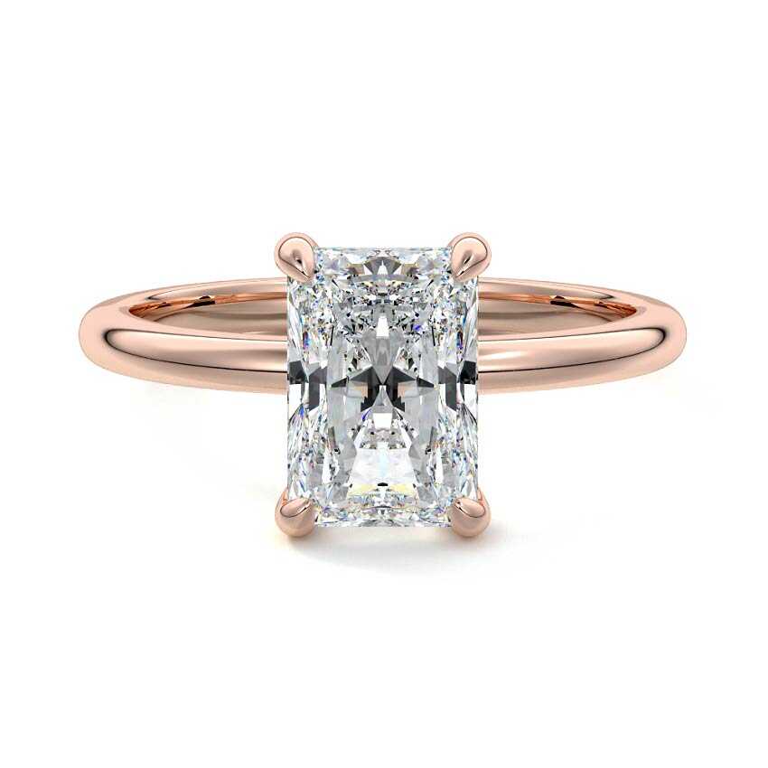 This exquisite solitaire engagement ring features a stunning radiant cut lab grown diamond, renowned for its captivating brilliance and unique cropped-corner rectangular silhouette. Set gracefully on a polished band, it offers a timeless yet modern expression of love and commitment.