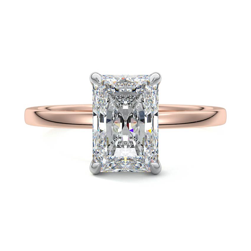 This exquisite solitaire engagement ring features a dazzling radiant cut lab grown diamond, renowned for its brilliant sparkle and sophisticated rectangular outline with subtly cropped corners. Set on a sleek rose gold band, its minimalist design beautifully highlights the stone's captivating fire and clarity, offering a blend of modern elegance and timeless appeal.