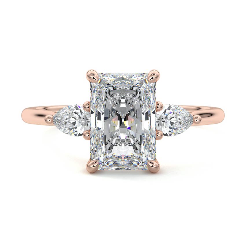 This captivating three-stone engagement ring features a stunning radiant cut lab grown diamond at its heart, exquisitely flanked by two graceful pear-shaped side stones. Its sophisticated design, sparkling with brilliant-cut facets, symbolizes a beautiful past, present, and future with exceptional radiance.