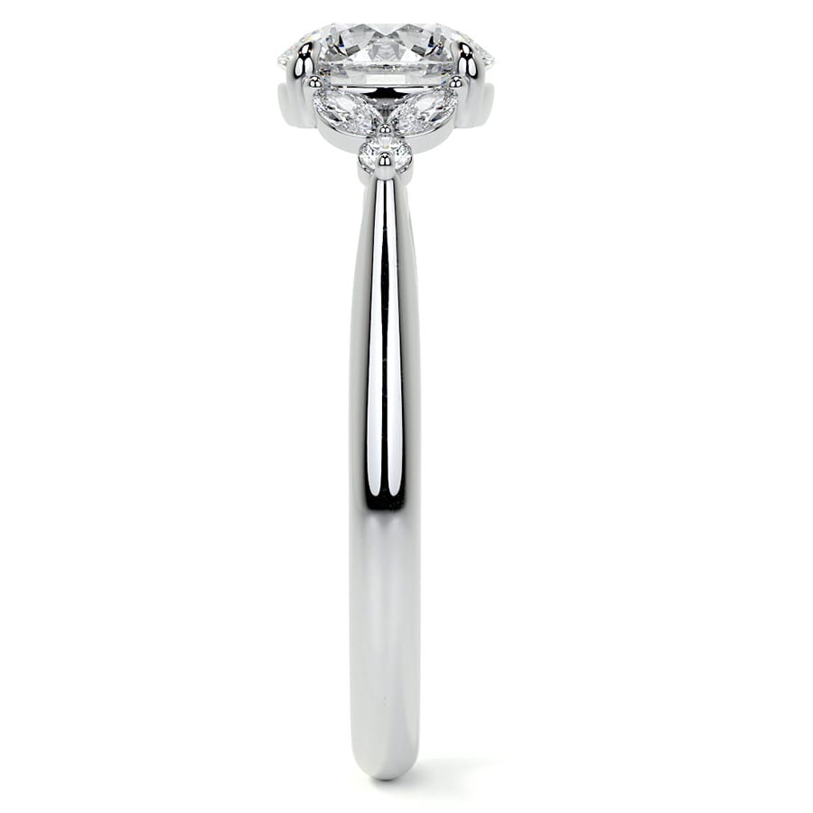 This exquisite engagement ring showcases a brilliant round cut lab grown diamond, radiating exceptional sparkle. Flanked by delicate, nature-inspired clusters of marquise and round accent diamonds on the shoulders, the design evokes the elegance of blooming flora.