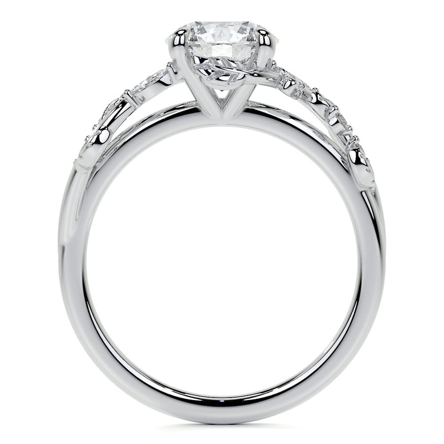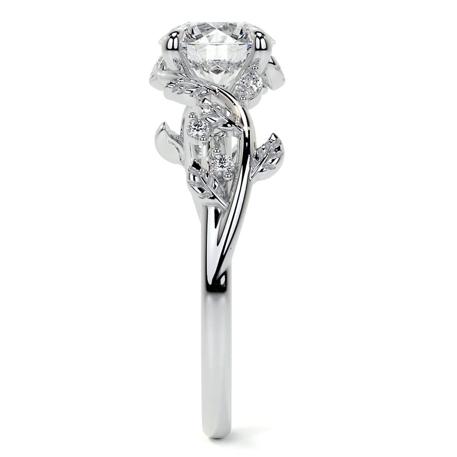 This enchanting Nature Inspired engagement ring features a dazzling Round cut lab grown diamond, perfectly held in a secure setting. Its unique band is adorned with delicate leaf and vine motifs, beautifully accented with sparkling sidestones, embodying a blend of natural beauty and timeless sophistication.