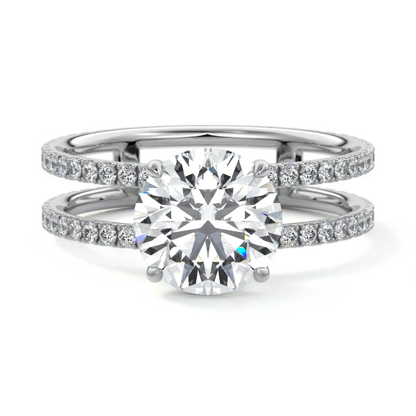 This exquisite ring features a brilliant Round cut lab grown diamond, elegantly set atop a modern split shank band adorned with dazzling pave diamonds. The harmonious blend of classic sparkle and contemporary design creates a truly captivating piece.