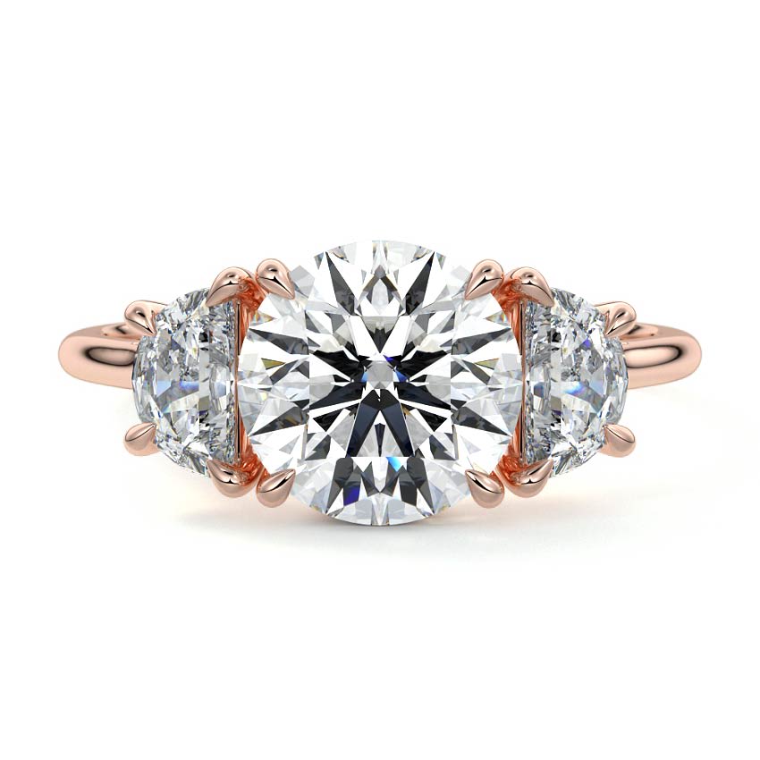 This elegant three-stone engagement ring showcases a brilliant round cut lab grown diamond at its center, beautifully flanked by two complementing side stones. A timeless design, it symbolizes past, present, and future, making it a perfect choice for enduring love.