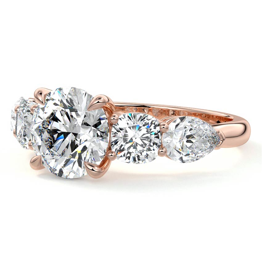 A captivating three-stone engagement ring showcasing a brilliant round cut lab grown diamond at its center. This design is beautifully accentuated by an arrangement of dazzling round and elegant pear-shaped side diamonds, creating a symphony of sparkle and sophisticated charm.