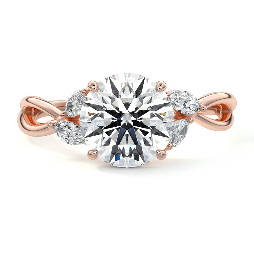 This captivating engagement ring features a brilliant round cut lab grown diamond, elegantly cradled by a unique twisted rose gold band. Accentuated by delicate pear-shaped side diamonds, its nature-inspired design embodies organic beauty and timeless sophistication.