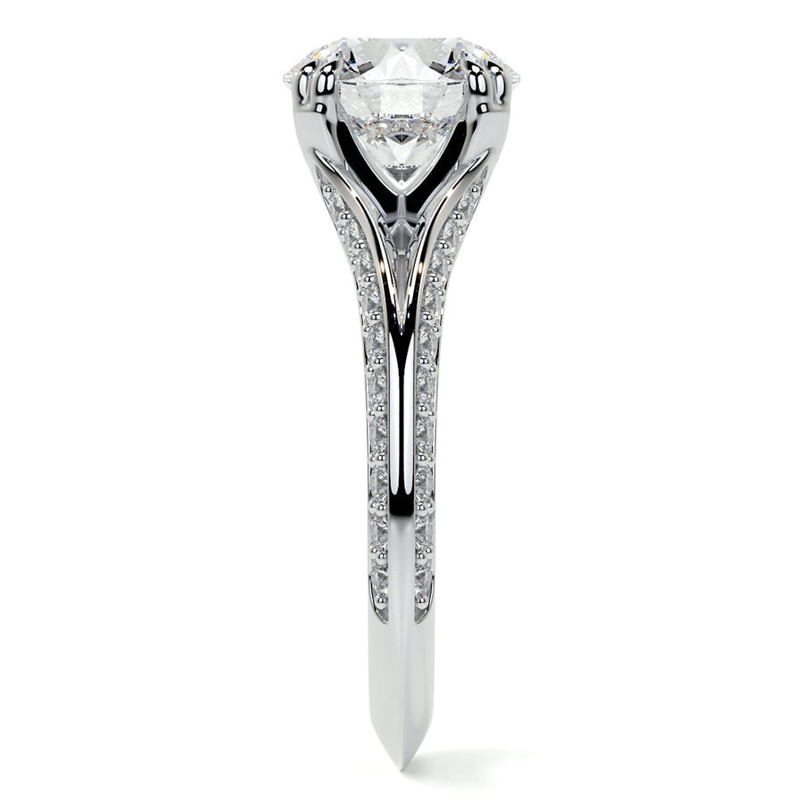This captivating engagement ring features a dazzling round cut lab grown diamond, exuding exceptional brilliance. The unique twisted pave band, adorned with shimmering accent diamonds, elegantly cradles the center stone, creating a look of refined sophistication and timeless allure.