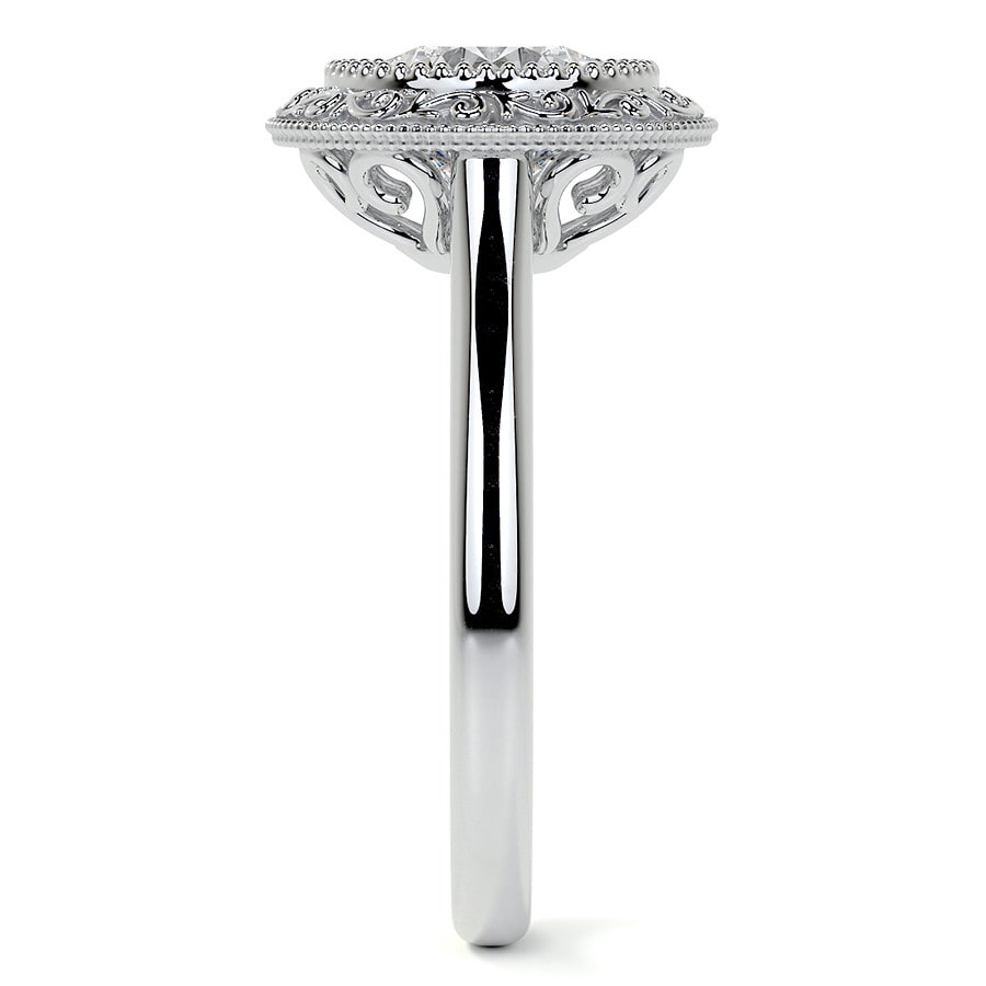 This captivating engagement ring showcases a brilliant Round cut lab grown diamond, elegantly framed by an intricate vintage-inspired halo. Detailed milgrain and scrollwork adorn the halo, imparting a timeless and sophisticated charm to the design.
