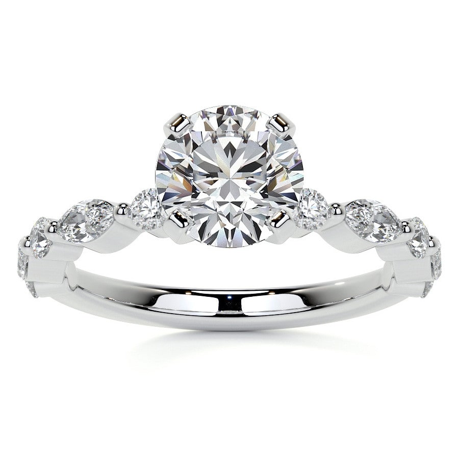 Round Four Prong Scalloped Lab Grown Diamond Engagement Ring with Accent Marquise