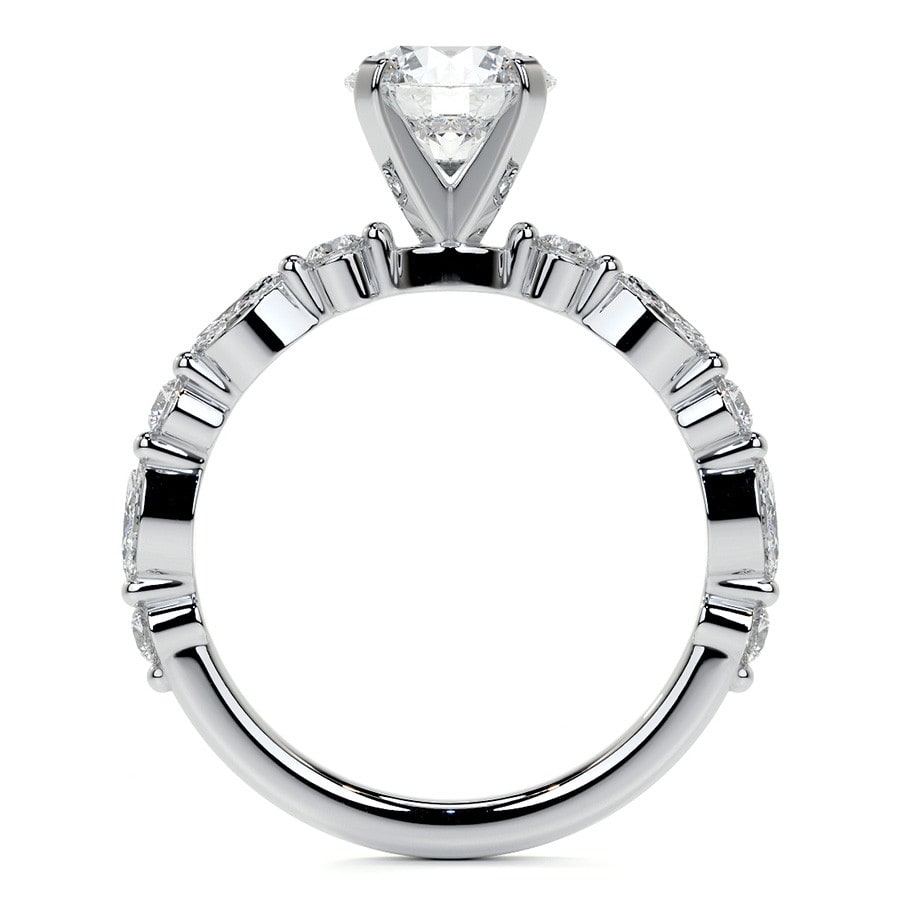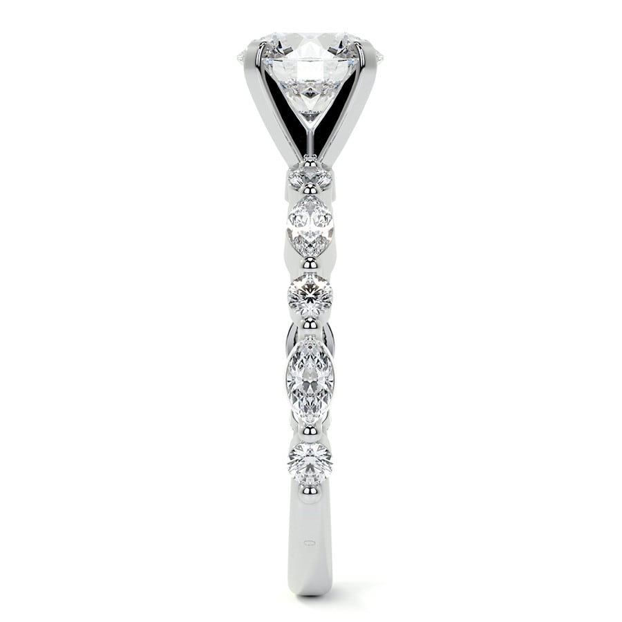 This exquisite engagement ring features a brilliant Round cut lab grown diamond, radiating timeless sparkle. Its elegant band is beautifully adorned with shimmering alternating accent diamonds, adding a touch of sophisticated charm.