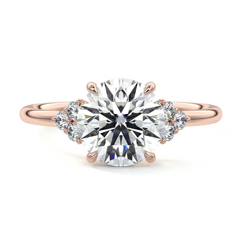 This exquisite solitaire engagement ring showcases a brilliant round cut lab grown diamond, radiating timeless sparkle. Elegantly flanked by delicate clusters of smaller diamonds, it offers a sophisticated blend of classic design and dazzling accents.