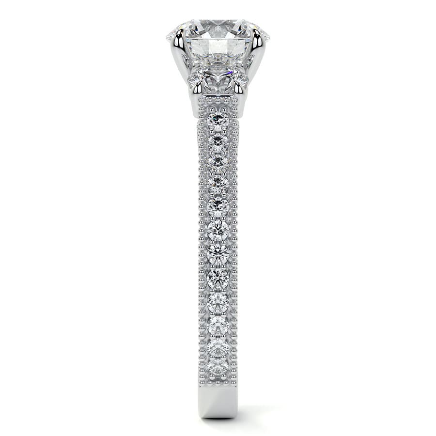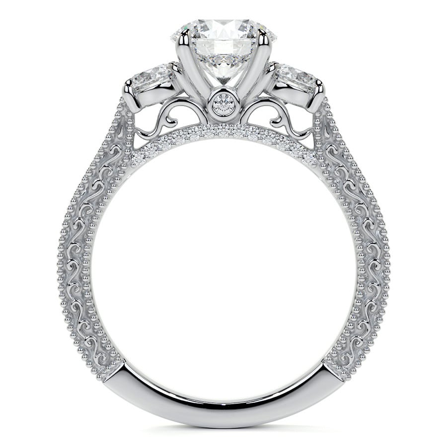 Round Three Stone Milgrain Lab Grown Diamond Engagement Ring with Scroll