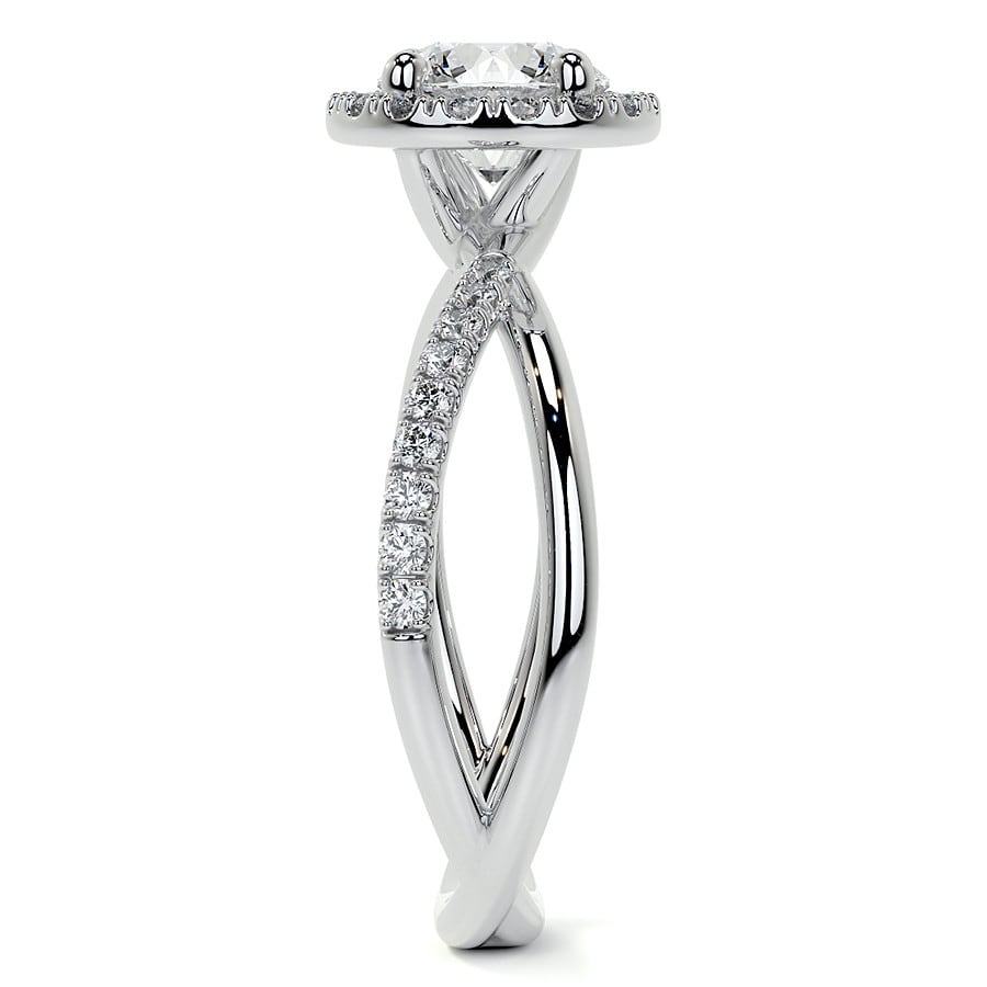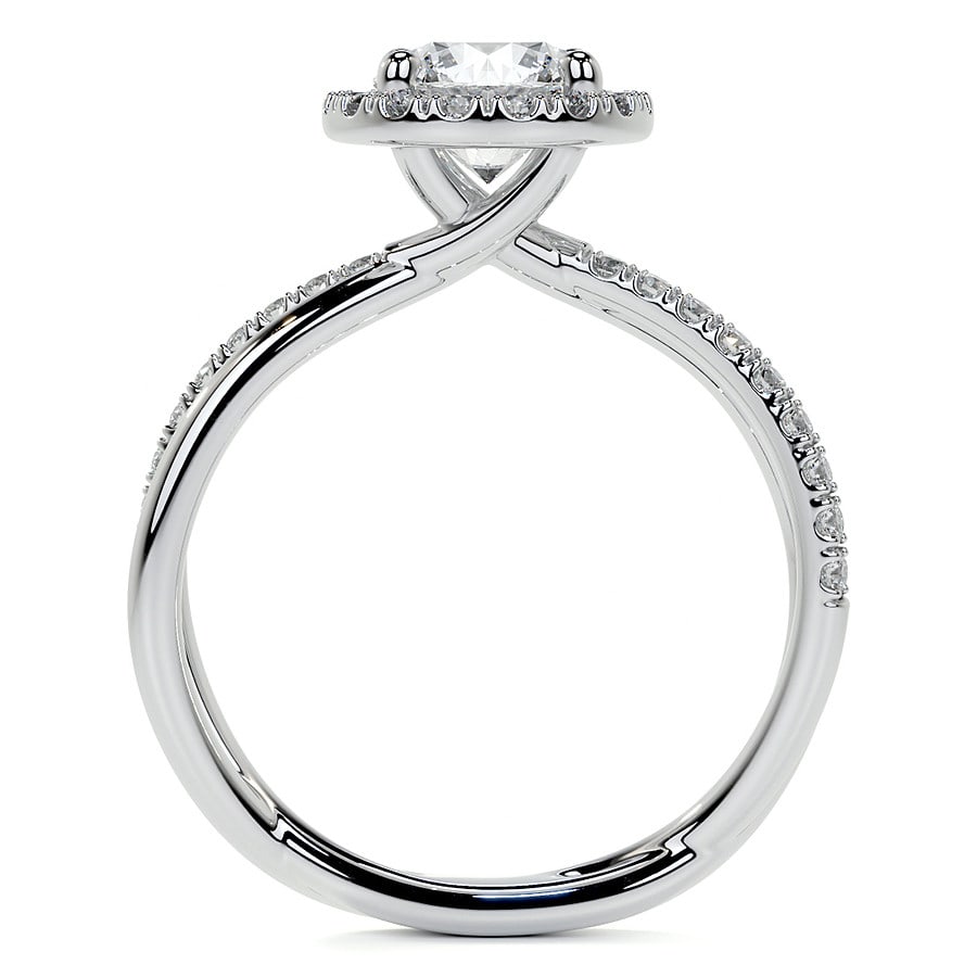 This stunning engagement ring features a brilliant round cut lab grown diamond, encircled by a dazzling halo of smaller diamonds, enhancing its sparkle. The elegant design is completed by a graceful twisted pave band, adding a touch of modern sophistication and continuous shimmer.