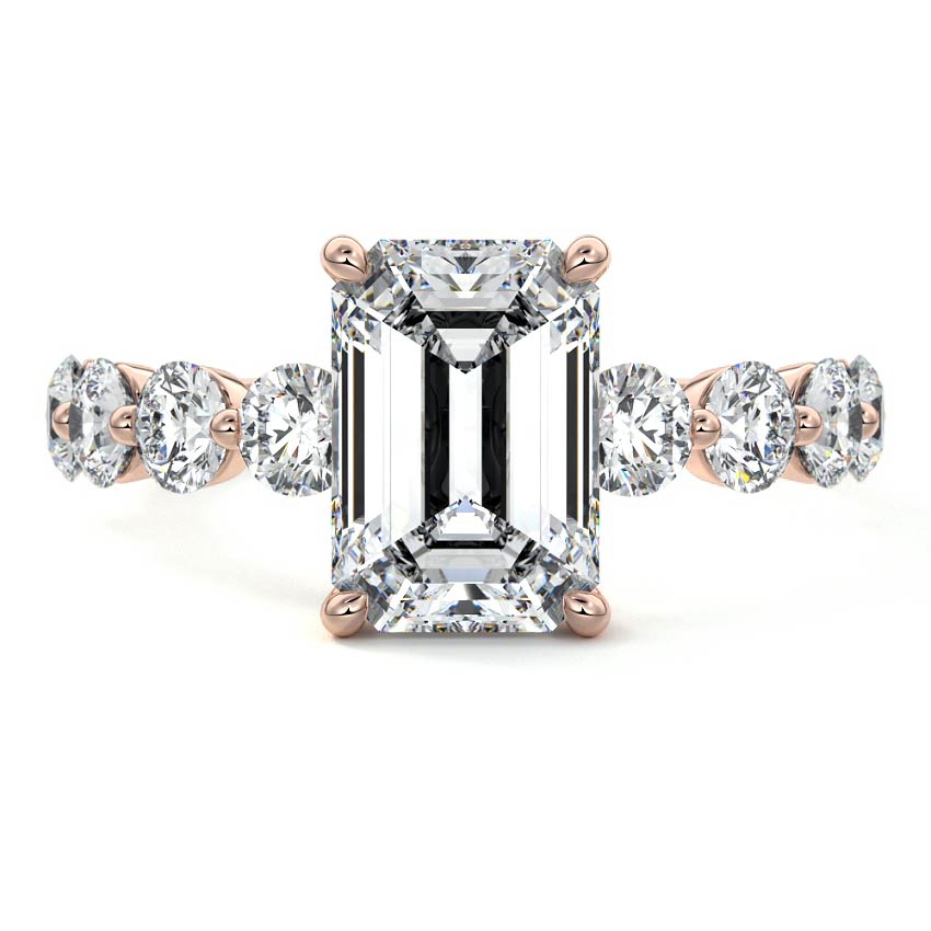 Showcasing a mesmerizing Emerald cut lab grown diamond as its centerpiece, this engagement ring exudes sophisticated brilliance. It is gracefully flanked by an array of perfectly matched round sidestones, enhancing its captivating allure and creating a truly distinguished look.