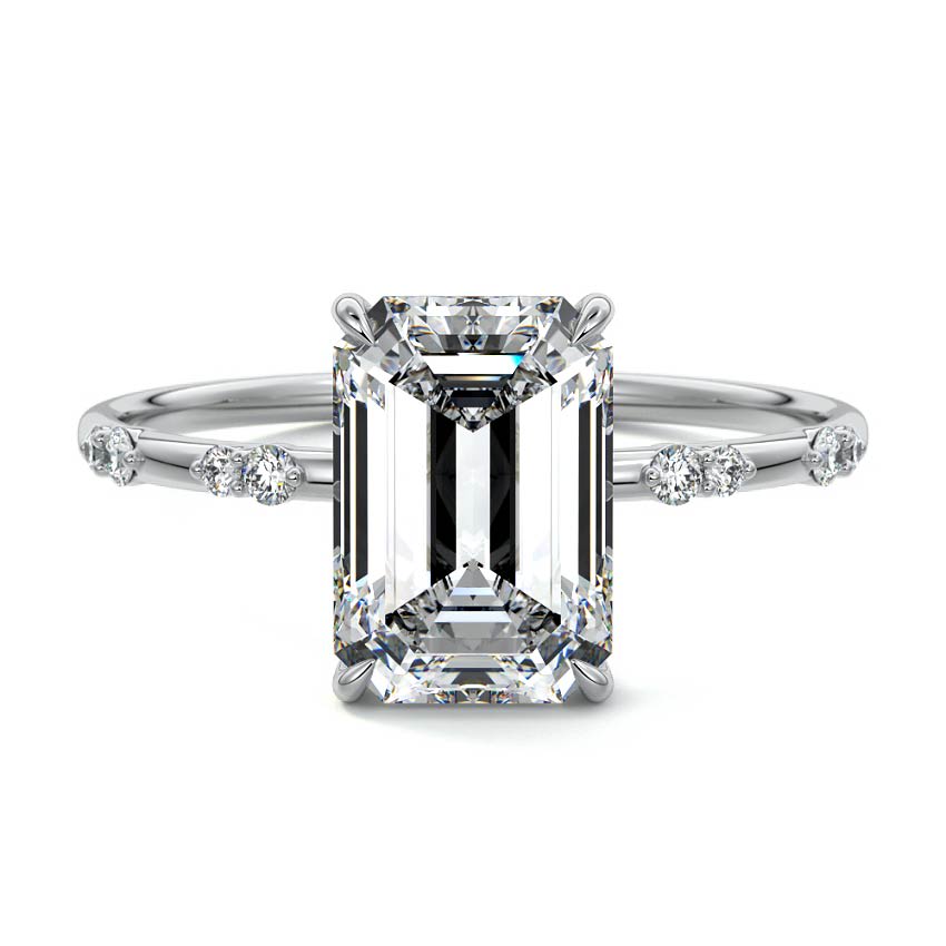 This elegant engagement ring features a stunning Emerald cut lab grown diamond as its captivating centerpiece. The clean lines of the step-cut diamond are beautifully complemented by delicate sidestone accents along the slender band, creating a look of refined brilliance and timeless sophistication.