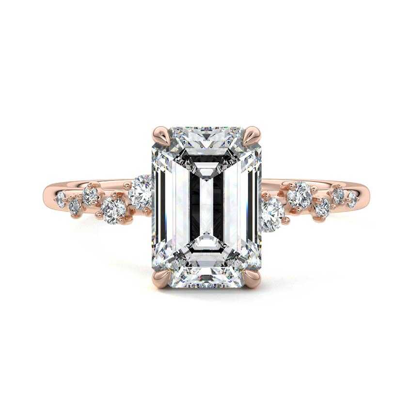 This captivating engagement ring features a stunning Emerald cut lab-grown diamond as its centerpiece, known for its elegant step-cut facets and rectangular silhouette. Adorned with a scattering of brilliant round sidestones along the rose gold band, this design offers a unique blend of modern sophistication and exquisite sparkle.