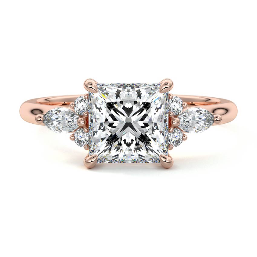 Showcasing a brilliant Princess cut lab grown diamond, this engagement ring is beautifully accented by a cluster of dazzling side stones. The geometric lines of the center stone are complemented by the elegant arrangement, creating a sophisticated and timeless appeal.