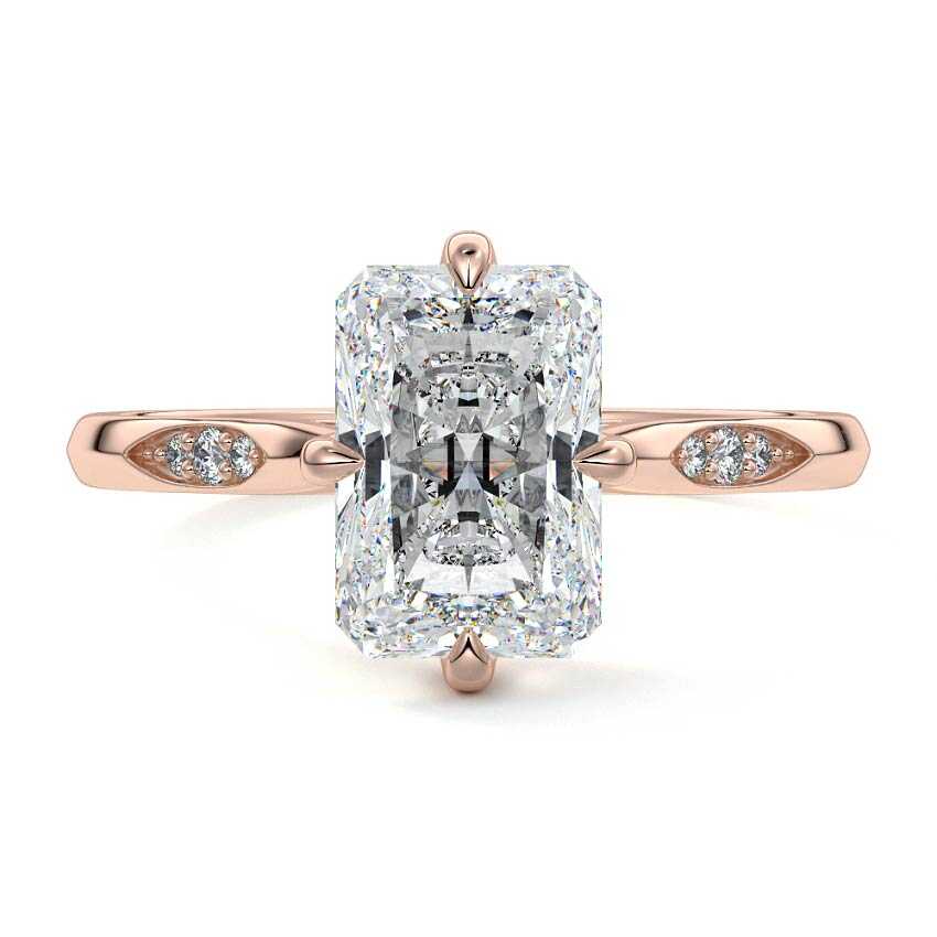 This captivating engagement ring showcases a brilliant Radiant cut lab grown diamond as its mesmerizing centerpiece. Adorned with delicate marquise-shaped sidestones featuring smaller diamonds, set on a polished rose gold band, it radiates modern elegance and exceptional sparkle. A perfect symbol of enduring love, designed for those who appreciate both contemporary style and timeless brilliance.