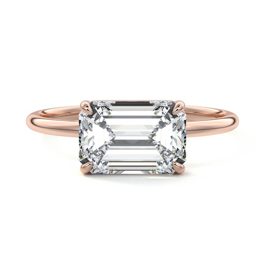 This exquisite solitaire engagement ring showcases a captivating emerald cut lab grown diamond, renowned for its elegant step-cut facets and sophisticated rectangular silhouette. Set gracefully on a sleek rose gold band, its minimalist design highlights the stone's inherent beauty and clarity, offering a timeless symbol of devotion.