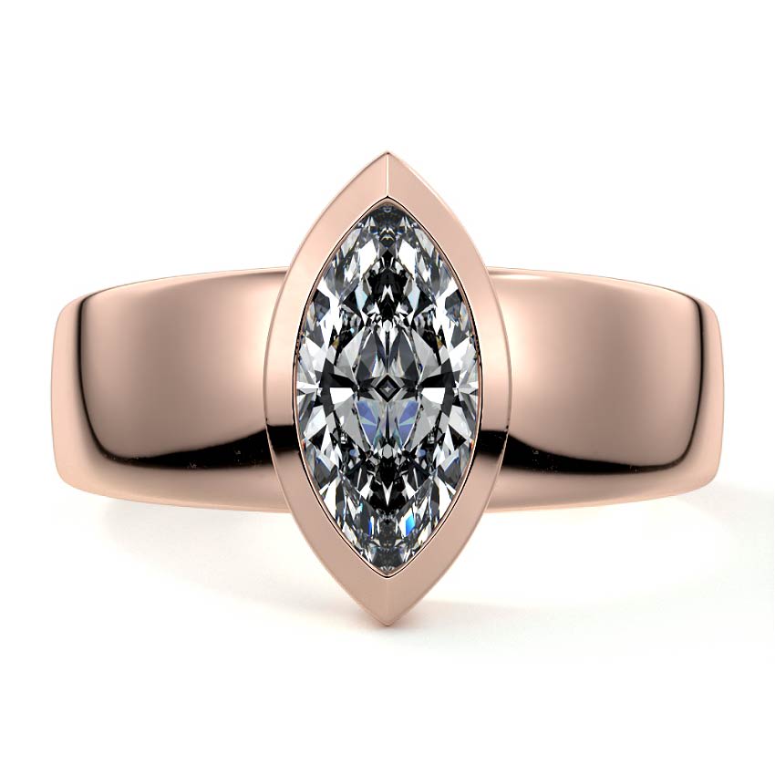 This sleek solitaire engagement ring showcases a captivating marquise cut lab grown diamond, artfully set within a bold and polished wide band. Its clean lines and elongated silhouette offer a sophisticated and contemporary statement.