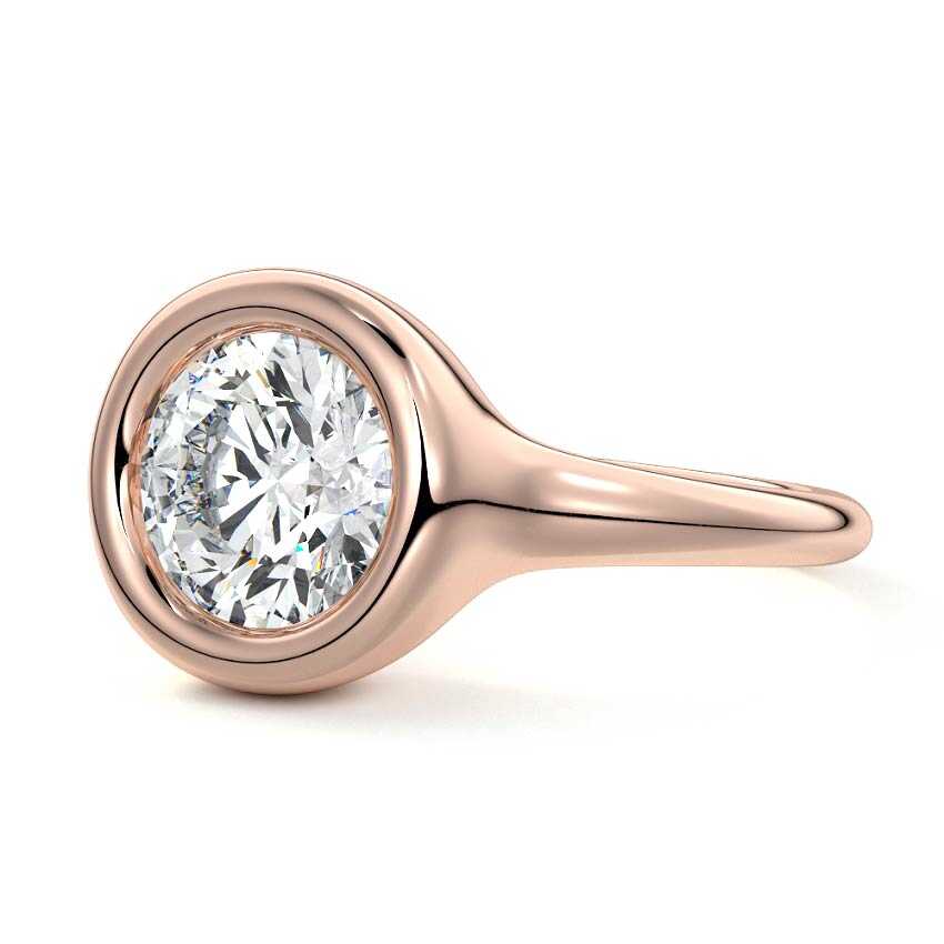 This exquisite solitaire engagement ring features a brilliant round cut lab grown diamond, securely held in a sleek bezel setting. Its minimalist design and smooth rose gold band exude timeless elegance and modern sophistication, perfect for a refined aesthetic.