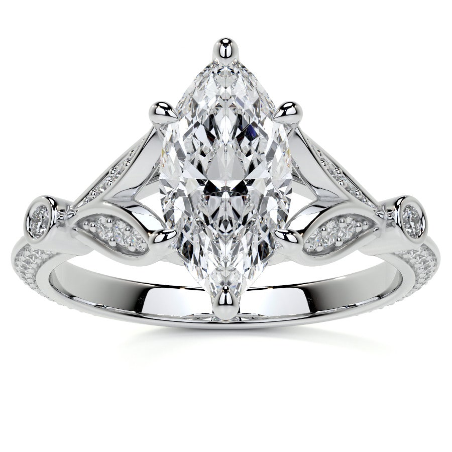 This exquisite vintage-inspired engagement ring features a dazzling marquise cut lab grown diamond, elegantly set amidst intricate metalwork and shimmering pave accents. Its unique design evokes a sense of timeless romance and sophisticated charm, perfect for an unforgettable proposal.
